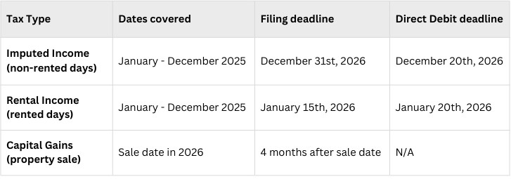 No major changes: tax rates remain 19% and 24%, with the same filing deadlines and obligations as the 2024 tax year (see 2024 guide). However, a few key updates do affect non-resident property owners. Let’s break them down: